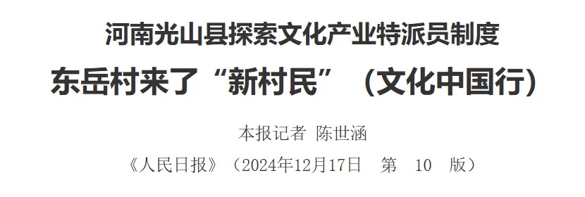 12月17日,《人民日报》10版头题刊发《东岳村来了“新村民”》文字报道,用1200余字详细介绍我县文殊乡东岳村通过文化产业特派员试点建设,用文化产业特派员制度调动社会资源,以文化创意为引擎,带动创新要素进入乡村,推动乡村实现整体性创新发展,让乡村全面振兴内生动力更足的情况,展现我县乡村振兴新成效。