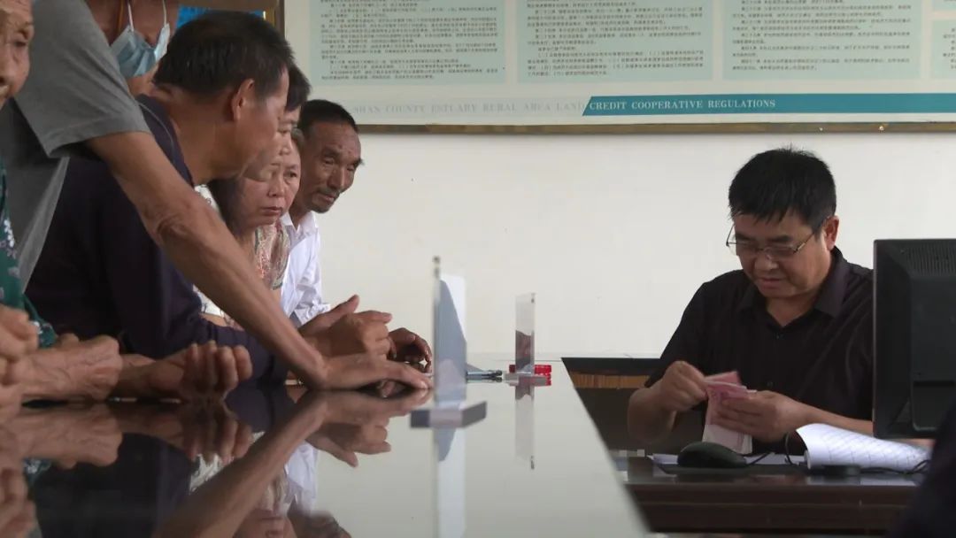 土地流转资金发放现场,江湾村两委干部认真对每人领取金额进行逐一核算,按照登记、签字、算账、按手印等一系列程序,将流转资金一分不差地发到村民手中,村民们领到了土地流转租金,个个喜笑颜开。